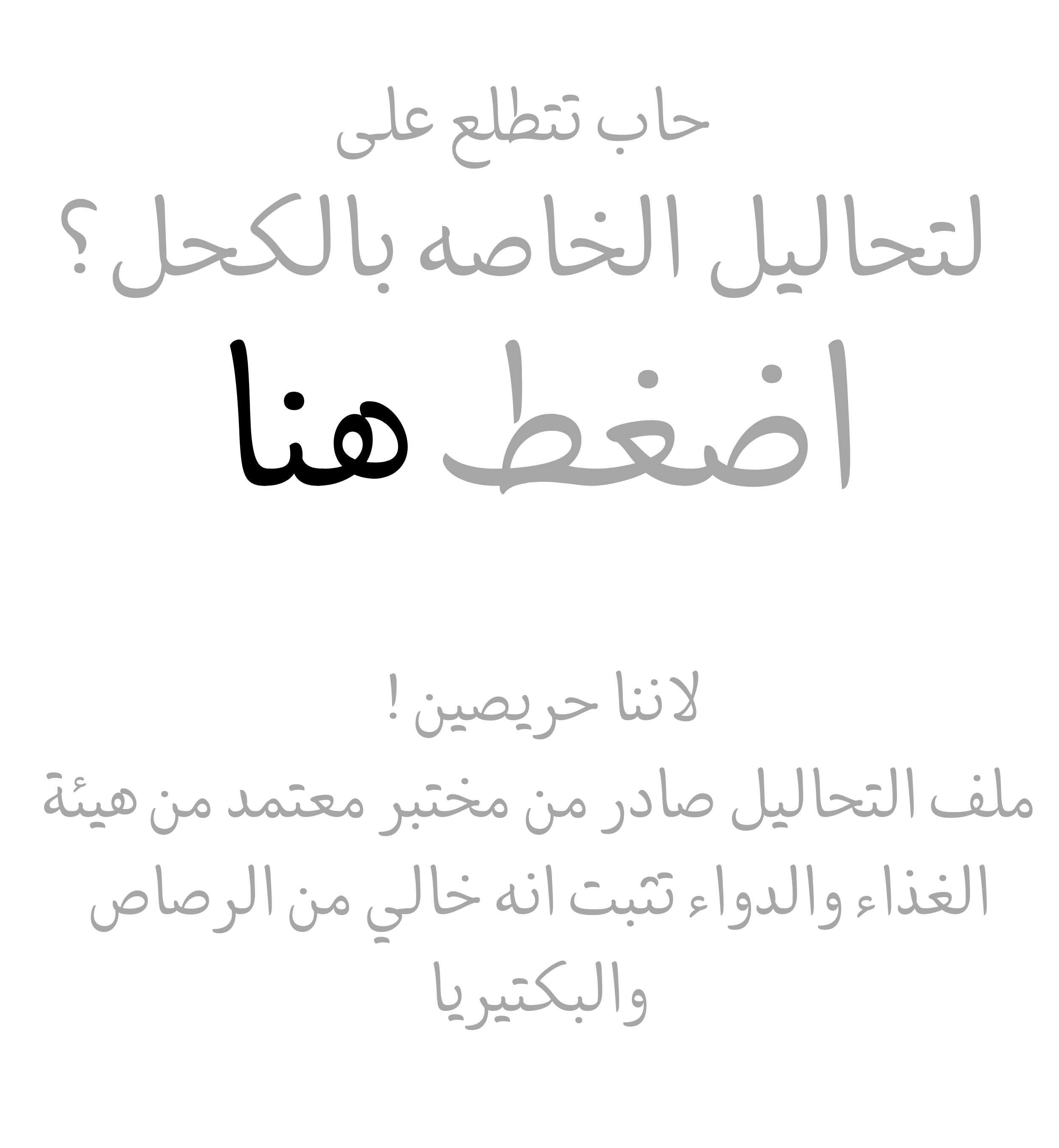 الكحل خاضع الى 22 تحليل من مختبر معتمد من هيئة الغذاء والدواء تثبت ان الكحل والاعشاب المضافه اليه خاليه من الرصاص والبكتيريا